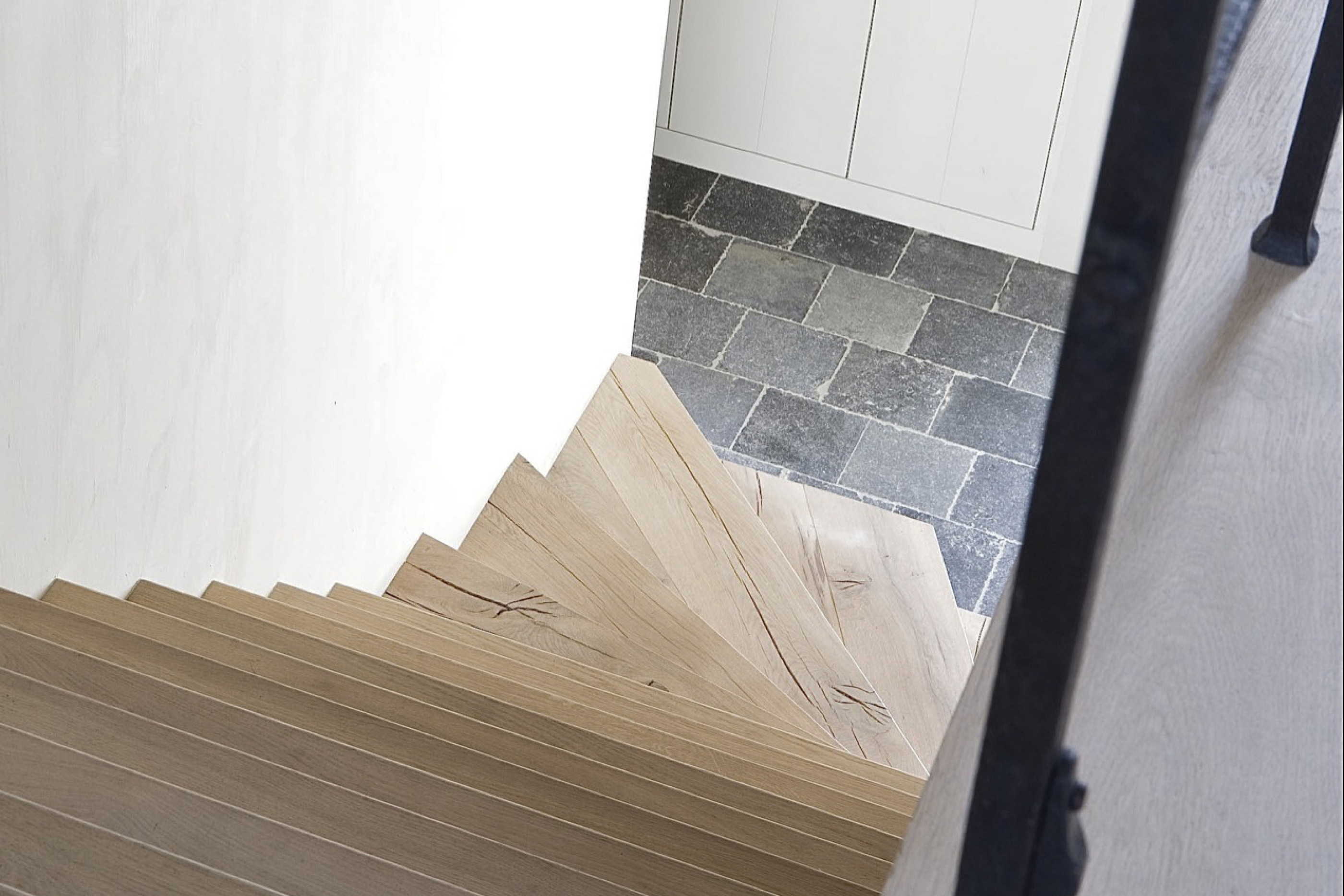 Hele fraaie belgisch hardstenen vloer op klein formaat. De kleurschakering en het formaat van deze vloer zorgen voor een authentieke uitstraling aan uw vloer.