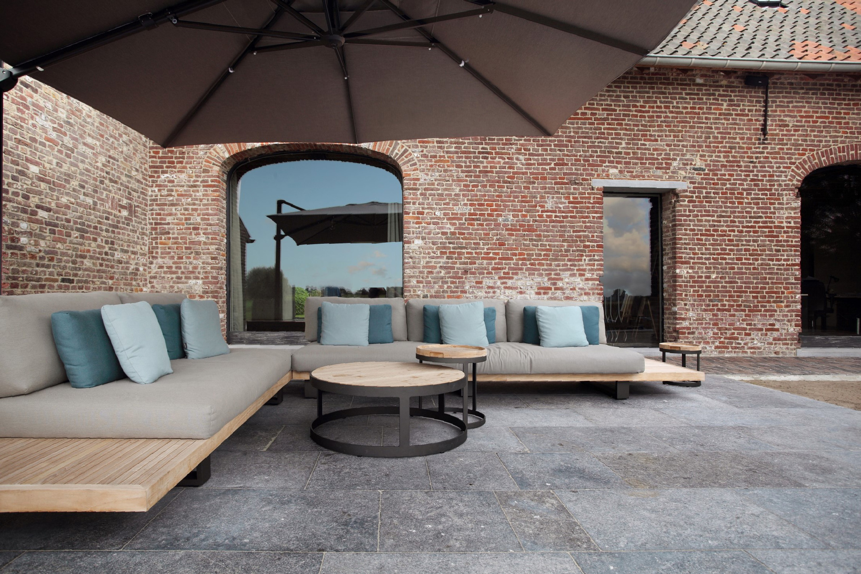 Door de zon en de regen zullen de blauwsteen vloeren altijd vergrijzen en door er op te leven, te belopen, te barbequene ontstaat een hele mooie patine met karakter.