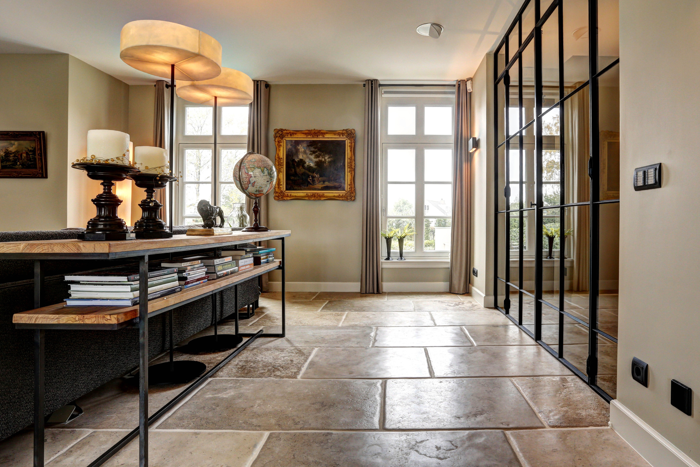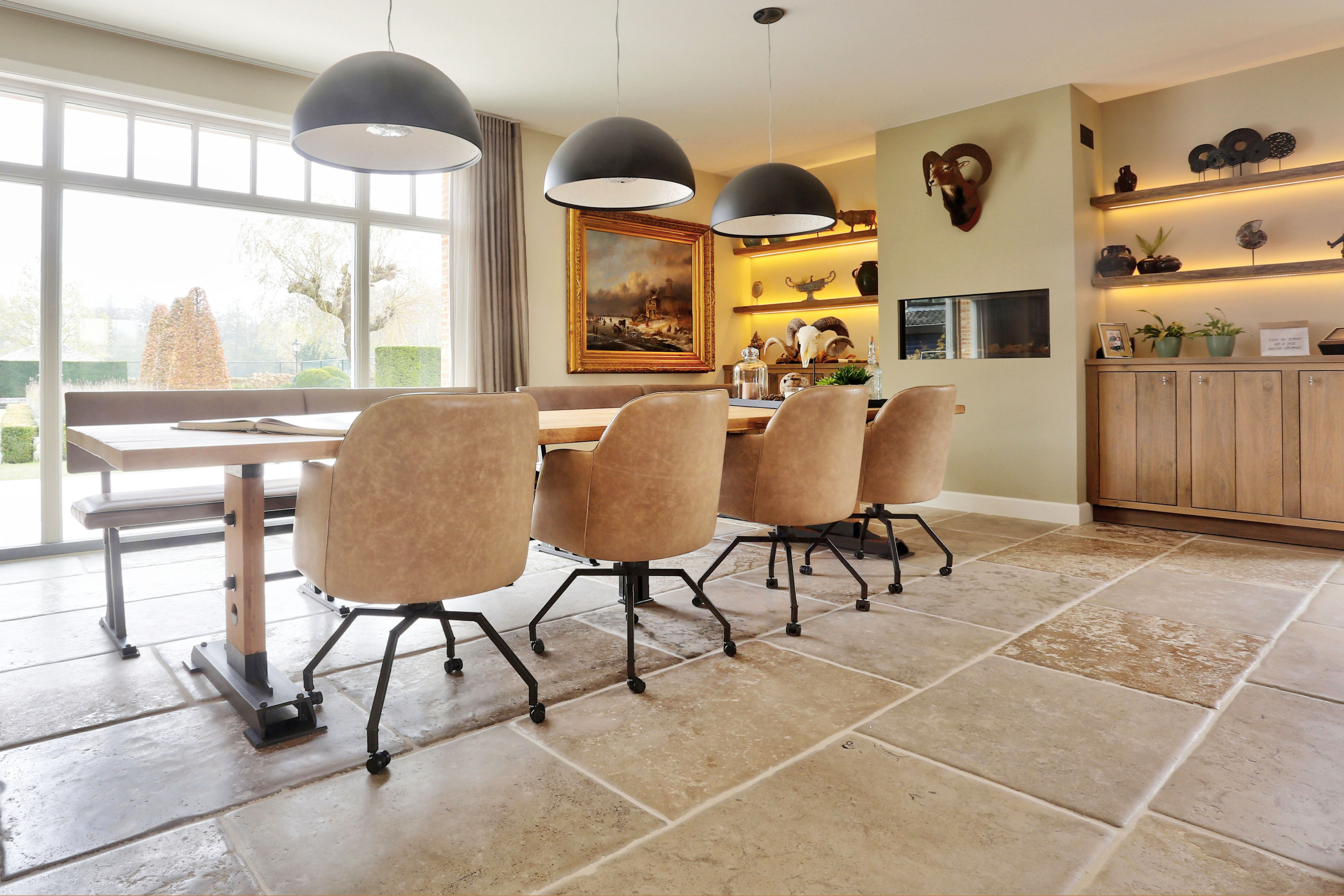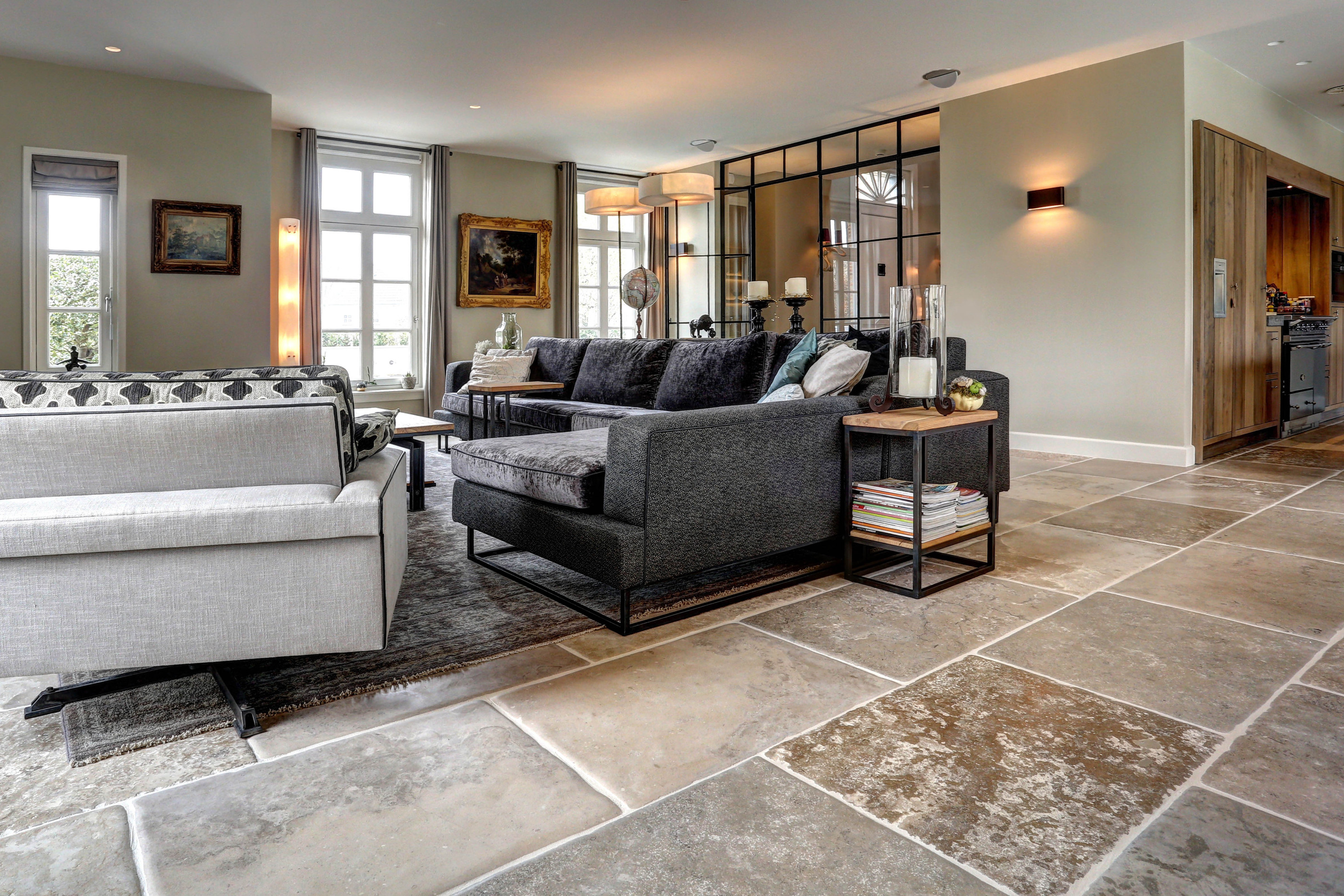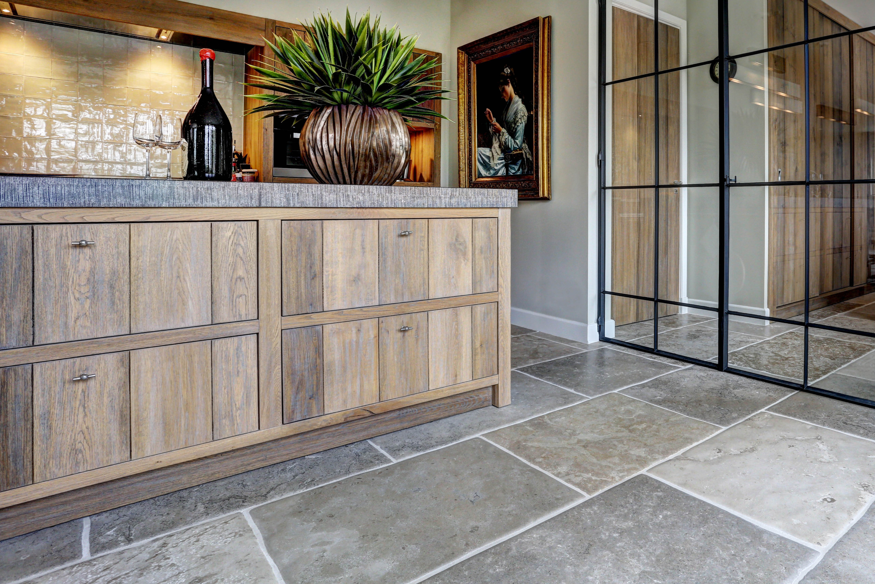 Deze natuursteenvloer van Franse kalksteen is onze trots. Wij verouderen de vloer nog helemaal met de hand. De boorden van de tegel worden heel mooi gebroken en het oppervlak wordt nog met de hand geschuurd zodat de Bourgondische dal het stoere kakarker krijgt.